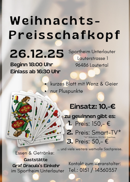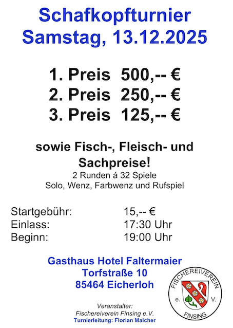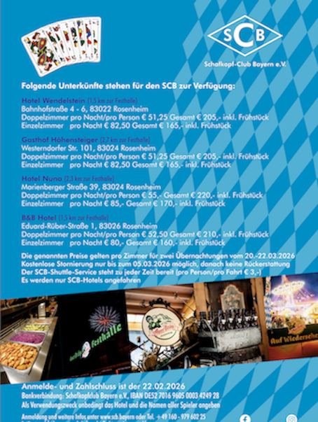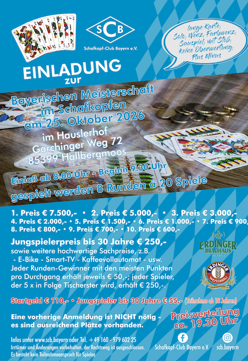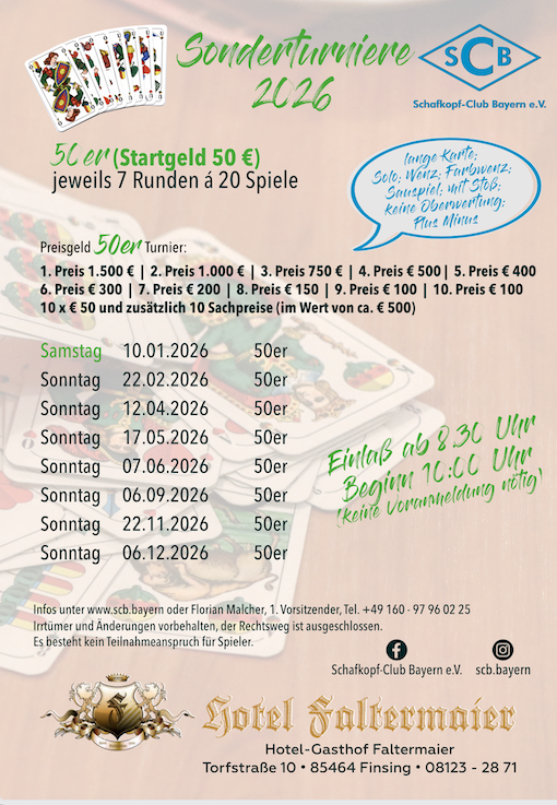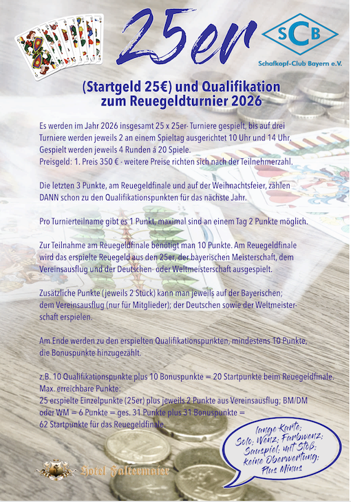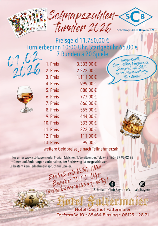 14:00 Uhr Schafkopf-Turnier – 4 Runden a 20 Spiele (Startg.: € 25,00)