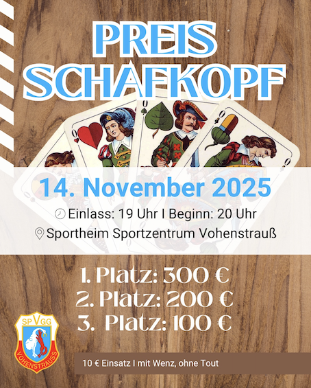weitere wertvolle Sachpreise Einlass: 19 Uhr I Beginn: 20 Uhr 01755414395 kurzes Blatt, mit Solo und Wenz Plus Punkte Web: https://www.spvgg-vohenstrauss.de/