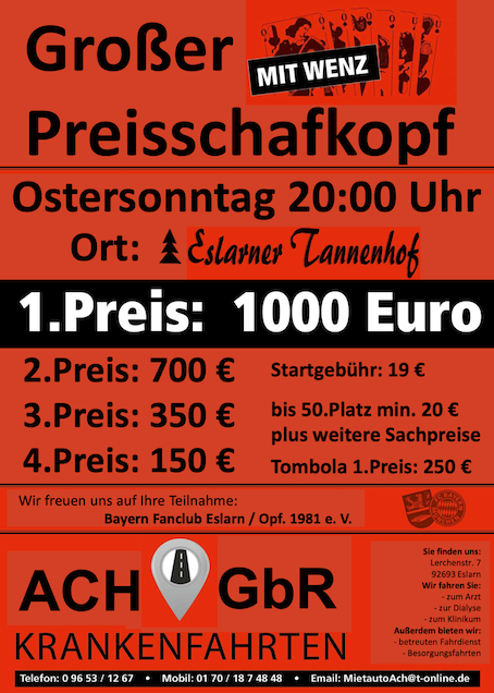 Zudem große Verlosung mit weiteren tollen Preisen, u.a. halbe Sau, 50-Zoll-TV, etc.