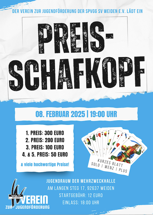 Das Turnier findet im neuen Stadel der Woid Hoamat statt und bietet für alle Schafkopfer genügend Platz. Neben den ersten drei Geldpreisen (200, 150 und 100 Euro) gibt es viele weitere tolle Sachpreise zu gewinnen. Gespielt wird mit der langen Karte, Solo und Wenz, Plus-Minus.