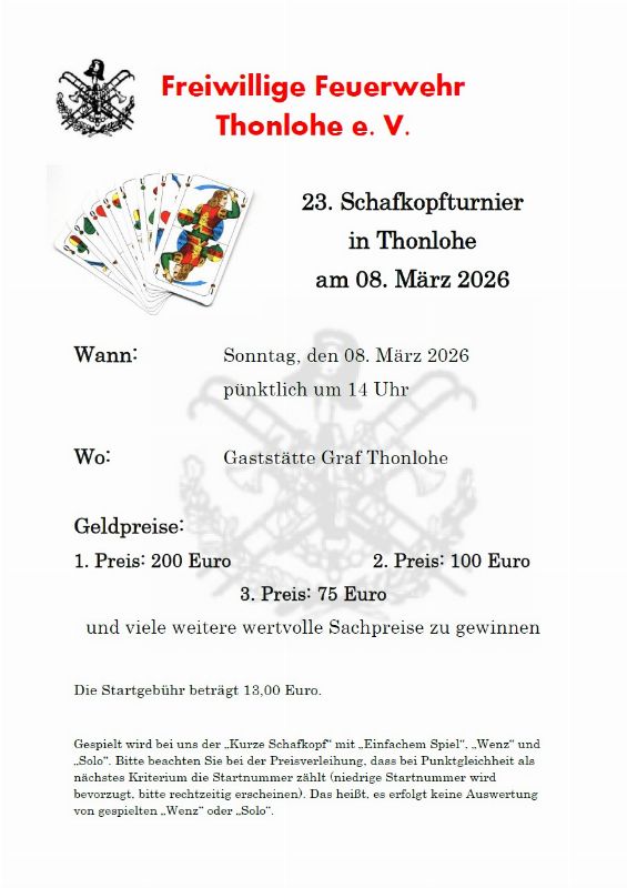 viele weitere wertvolle Sachpreise Gespielt wird bei uns der „Kurze Schafkopf“ mit „Einfachem Spiel“, „Wenz“ und „Solo“. Bitte beachten Sie bei der Preisverleihung, dass bei Punktgleichheit als nächstes Kriterium die Startnummer zählt. (niedrige Startnummer wird bevorzugt, bitte rechtzeitig erscheinen), d.h. es erfolgt keine Auswertung von gespielten „Wenz“ oder „Solo“. Tobias Köhl kurzes Blatt, mit Solo und Wenz Plus Minus Punkte
